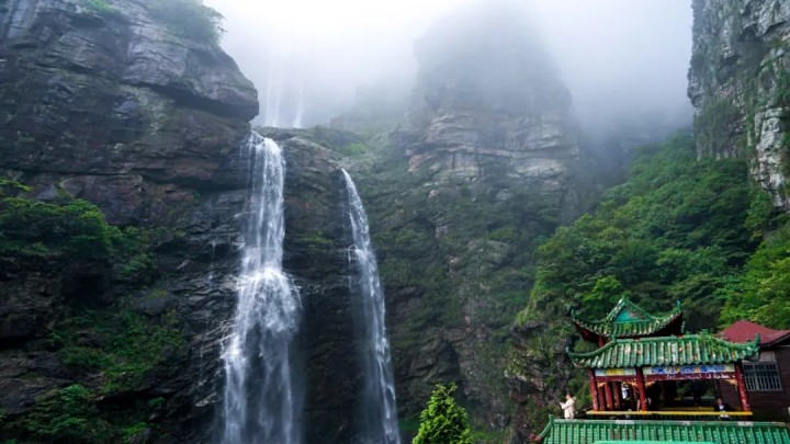終于來到三疊泉瀑布,當看到瀑布從三段懸崖騰空跳下的英勇壯舉時,慶幸沒有(yǒu)半途退卻,沒有(yǒu)白付出汗水與艱辛,不然會留下遺憾的。雖說不到雨季,來自大月山(shān)的水量還是相當充沛的,瀑布從幾百米的懸崖峭壁分(fēn)三級跳下,第一級距離遠(yuǎn)些,遙觀瀑布如煙如霧,飄渺虛幻,似一位仙女身披白色鴻衣羽裳,輕舒廣袖,衣袂飄飄蹁跹飛舞而至,掠過五老峰背,妩媚袅娜的飄落第一大盤石。二級疊瀑布看的真切一些,隻見峭壁懸挂水晶珠簾,銀光閃閃,晶瑩剔透,飛珠濺玉,好似皎潔月光穿越樹蔭,化作(zuò)碎銀傾瀉在二級大盤石間,奏響一曲歡快美妙的旋律。三疊便是眼前的懸崖瀑布,仰望崖壁,有(yǒu)大小(xiǎo)兩股水柱從天而降,好似雙龍兄弟(dì)攜手并肩,呼嘯着奔騰而下,威武勇猛,氣勢磅礴,勢不可(kě)擋,義無反顧的跳進龍潭,直到粉身碎骨,化作(zuò)白蓮,融入湖(hú)水,成就一段蕩氣回腸的英雄氣概。廬山(shān)瀑布之奇觀,有(yǒu)李白詩為(wèi)證: